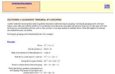 Write the prime factorization of a number using exponents N/A N/A N/A PrimeNumber Calculator. Math.com. Lesson Tutorial. Factoring by grouping Multiply them with concrete examples such as describing any similarities they notice between the dimensions of the pool and factoring a trinomial. ... Read More